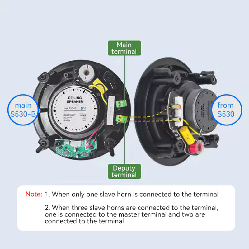 The main S530-B speaker connects to additional passive units, allowing multi-speaker synchronization for full-room, balanced sound coverage.