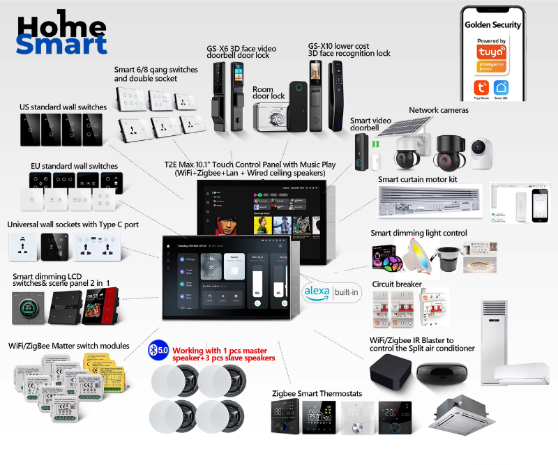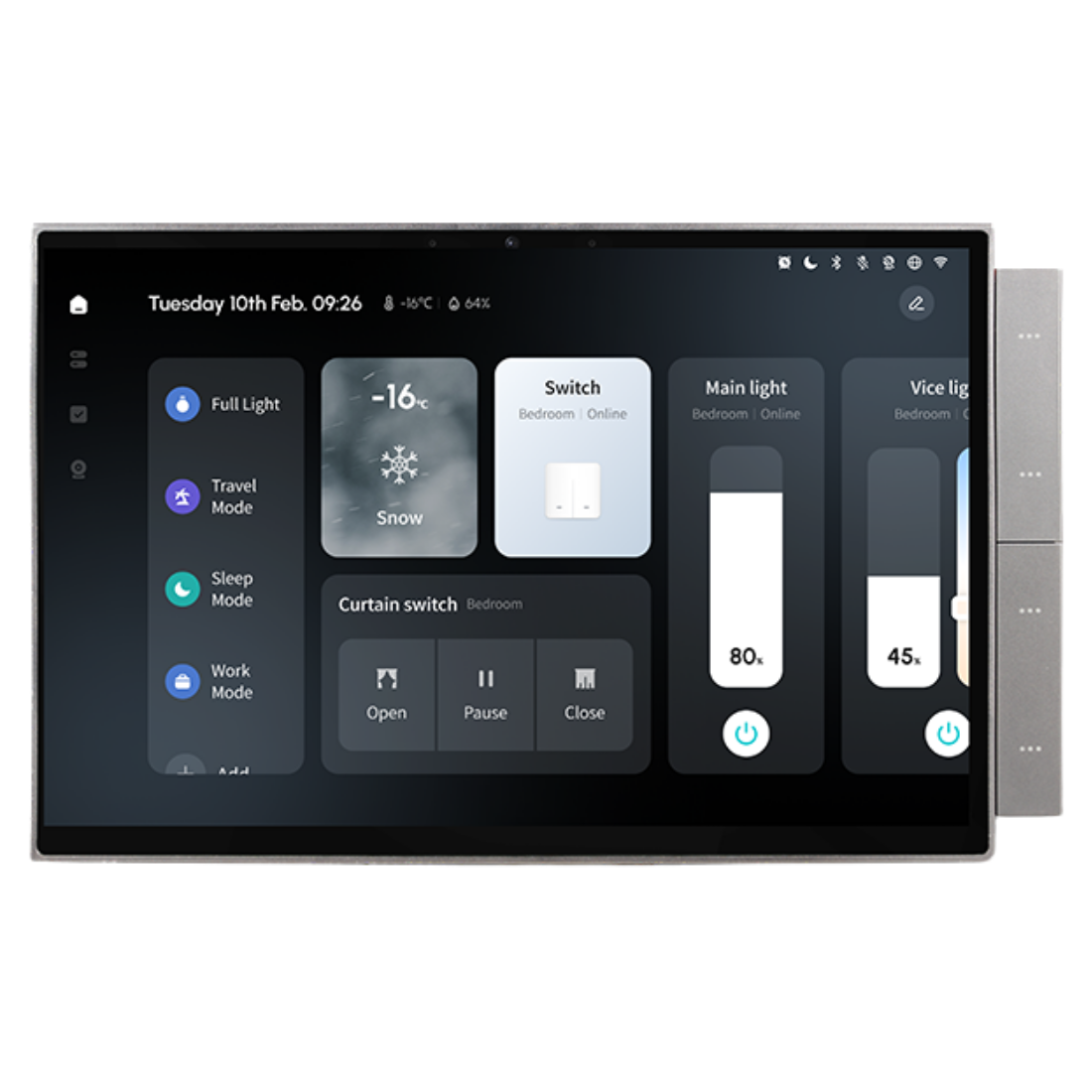 The HomeOne T10 unites three systems in one — Zigbee Gateway, Music Center, and Intercom Display. Even without internet, it keeps your smart devices connected locally — from wall switches and dimmers to curtain motors, thermostats, and cameras. Control, automate, and monitor your entire smart home from a single 10.1” touch panel.