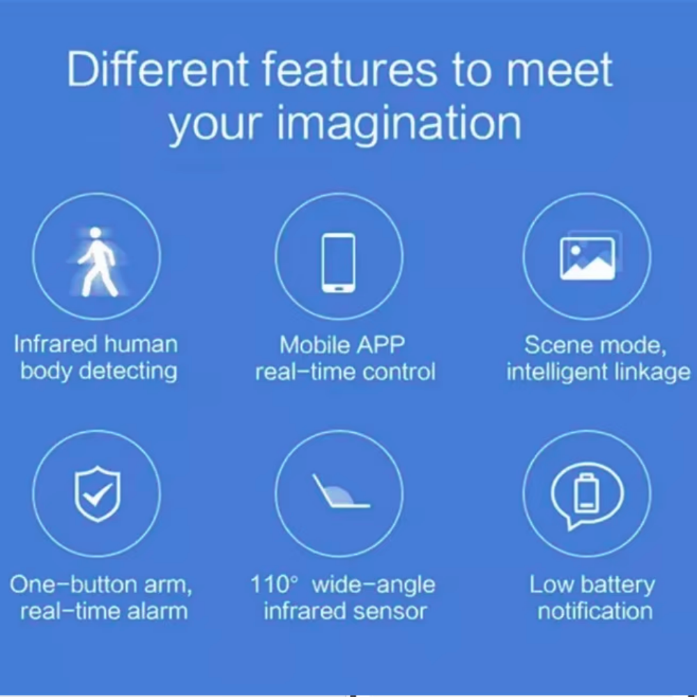 Infrared motion sensing, real-time app control, and smart scene automation — featuring a 110° wide-angle sensor, instant alarms, and low-battery alerts for reliable home protection.