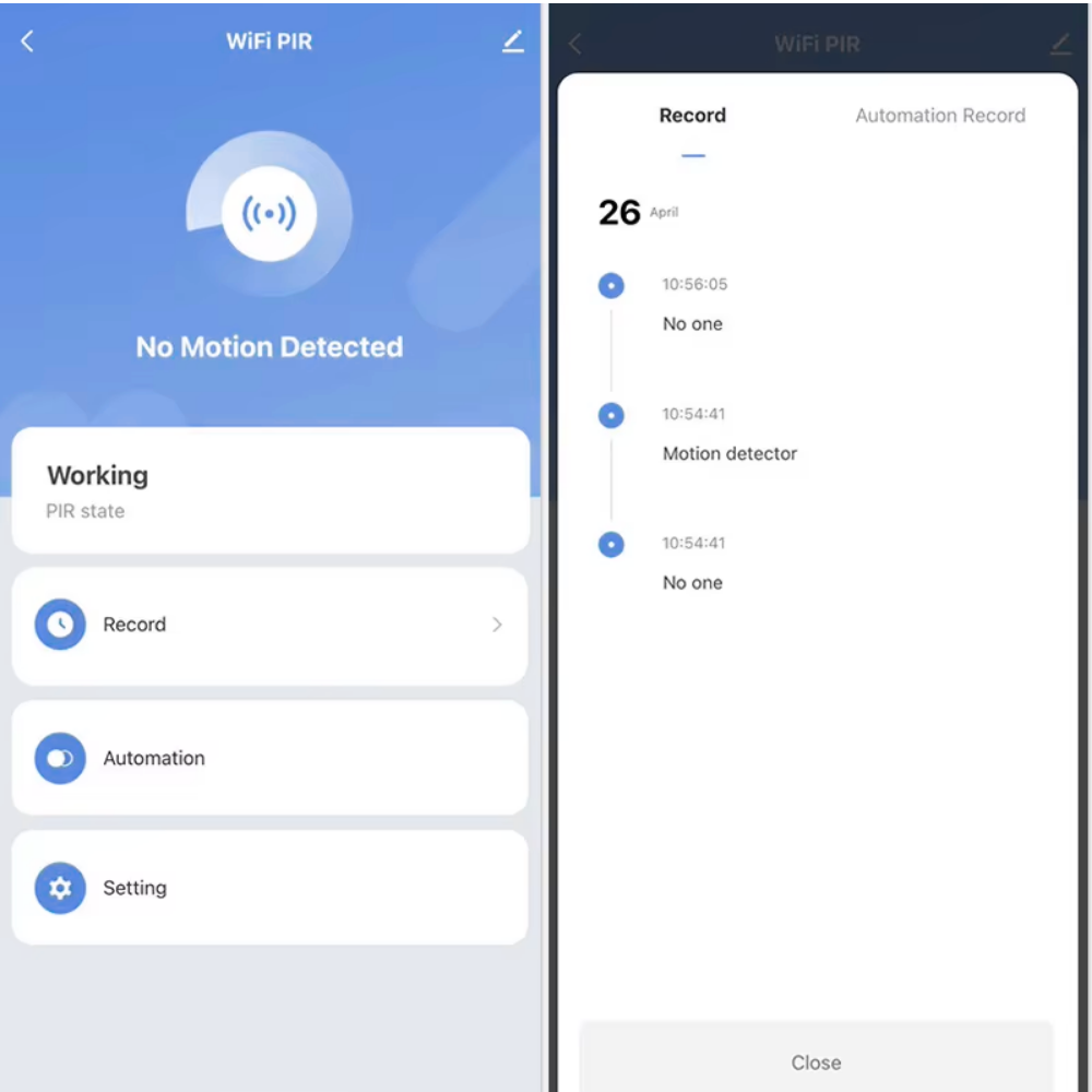 Track every motion event with detailed timestamps and automation records — all stored within the Smart Life app for full monitoring and control.